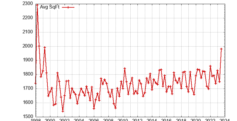 Examination of other San Mateo County cities revealed that eight other cities (Foster City, Los Altos Hills, Menlo Park, Millbrae, Pacifica, Portola Valley, San Carlos, & Woodside) also had a significant house size increase as of the Aug 18 close of escrow data. Examining more of Silicon Valley revealed that Palo Alto was the only city in Santa Clara County to have a similar increase in the size of houses sold. With no other significant changes seen in the trends of those cities, it is hard to assign a cause. Perhaps the continuing problems reported for the city of San Francisco have changed the long-term plans of the residents of nearby cities. People less motivated by jobs (near retirement) or children (off to college) to stay put might be deciding their long-term future is elsewhere.